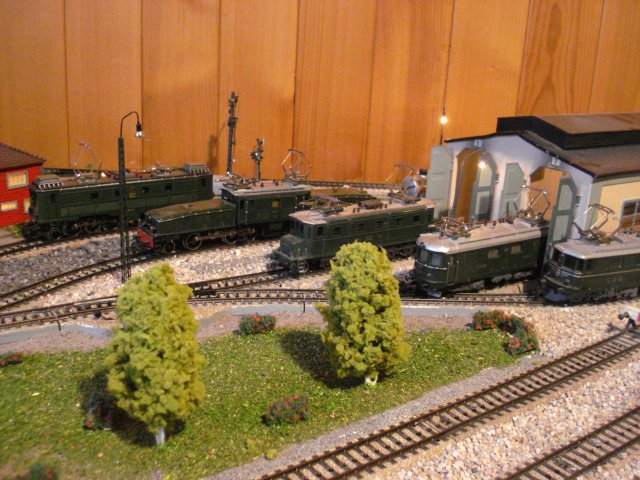 La plus belle époque ferroviaire, avec locomotives des années 1920 à 1950 (Be 4/6 12303 Swisstoys, Ce 6/8 III 3015 Märklin, Ae 4/7 10901 HAG, Re 4/4 I 427 Märklin et Ae 6/6 11403 HAG)